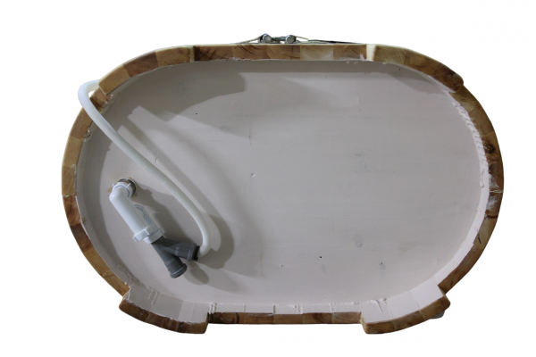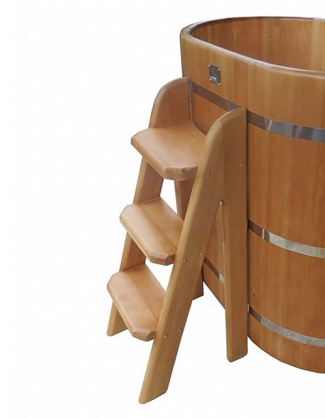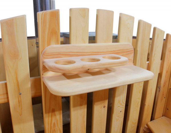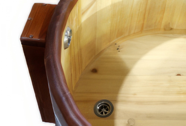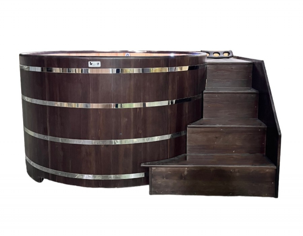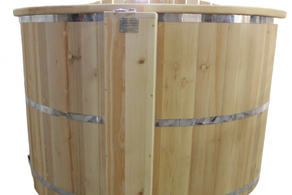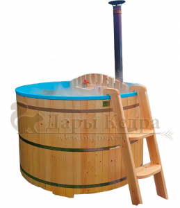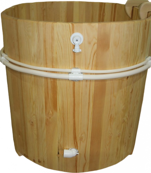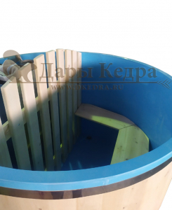 Это уличная подогреваемая купель с круглой внутренней чашей из термопластика. Для удобства пользования купель оборудована лавочками, приставной и внутренней лестницей. Нагрев воды происходит за счет встроенной печи, которая находится внутри купели за перегородкой. В комплектацию этой модели входит савок с длинной ручкой, который позволяет извлекать угли после эксплуатации изделия. Термопластик устойчив к воздействию температур, облегчает уход за купелью и увеличивает срок ее службы.