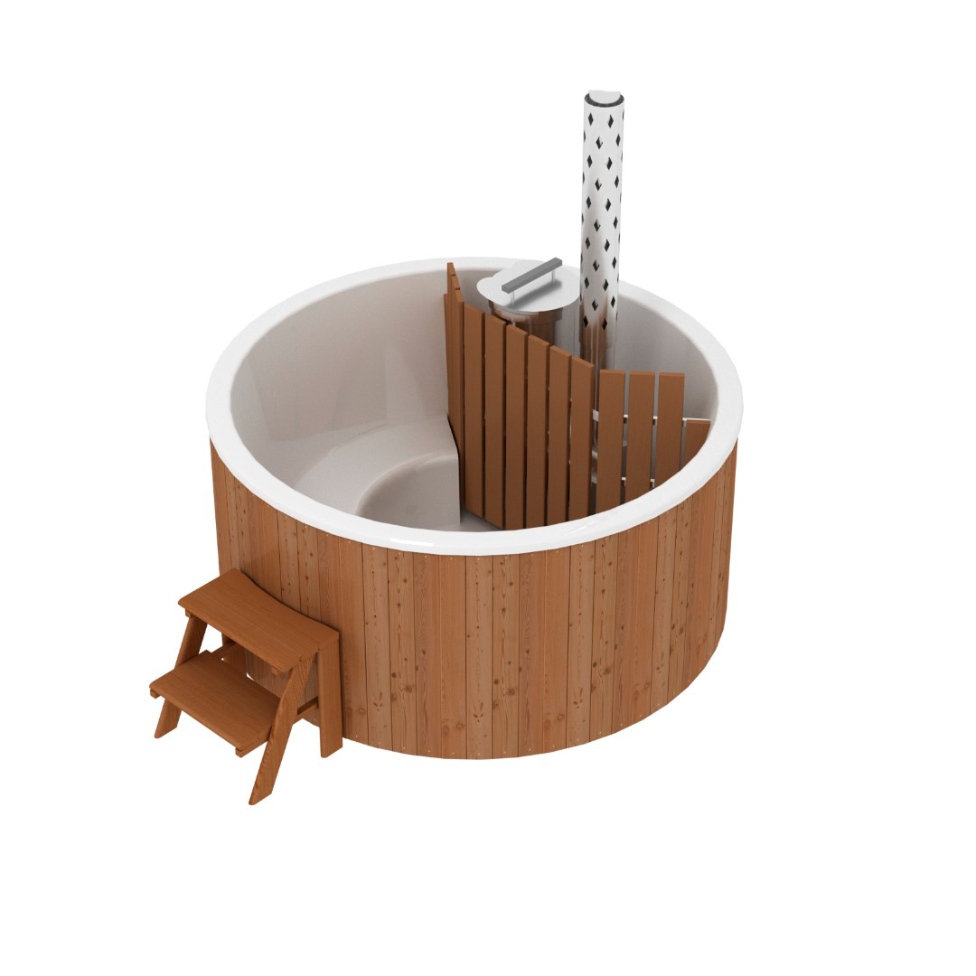 Фурако круглая из кедра с термопластиковой вставкой со встроенной печью Это уличная подогреваемая купель с круглой внутренней чашей из термопластика. Для удобства пользования купель оборудована лавочками, приставной и внутренней лестницей. Нагрев воды происходит за счет встроенной печи, которая находится внутри купели за перегородкой. В комплектацию этой модели входит савок с длинной ручкой, который позволяет извлекать угли после эксплуатации изделия. Термопластик устойчив к воздействию температур, облегчает уход за купелью и увеличивает срок ее службы. Парение на свежем воздухе – это отличный способ укрепить здоровье и поддержать организм в тонусе.