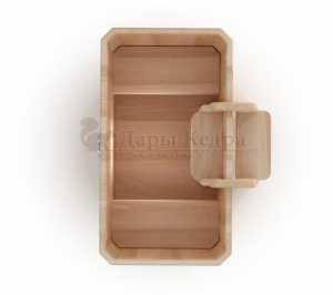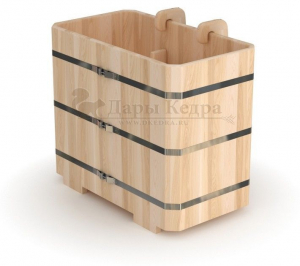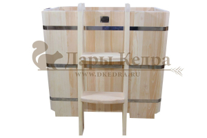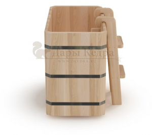 Представляет собой герметичную емкость для воды из кедра, которая предназначена для отдыха и охлаждения тела после процедур парения. Ширина прямоугольной купели равна ширине стандартных дверных проемов (78 см), поэтому занести в помещение ее можно в собранном виде. Благодаря прямоугольной форме купель хорошо впишется в угол помещения. Так же ее можно установить на улице. Прямоугольная купель оснащена лавочками, приставной и внутренней лестницей из кедра. Обручи из нержавеющей стали плотно прилегают к изделию, что позволяет равномерно распределить нагрузку воды и сохранить форму во время эксплуатации. При правильном уходе купель для бани не рассыхается и не подвергается гниению.