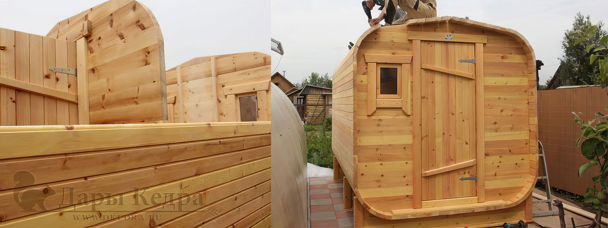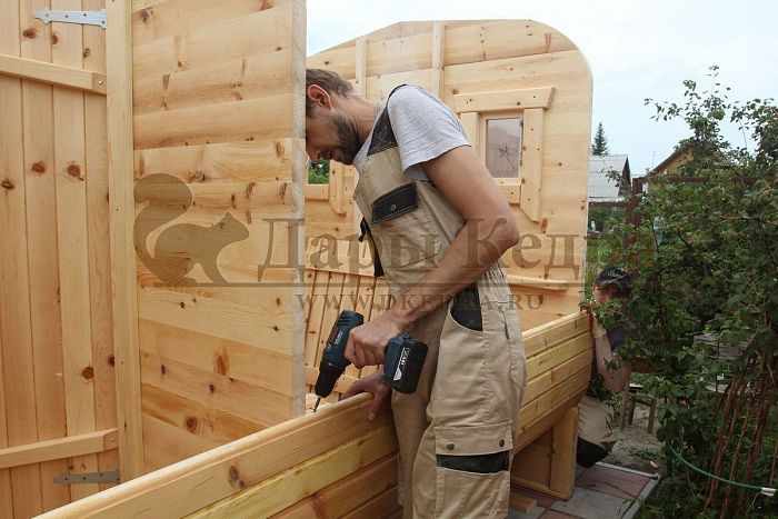Перед началом сборки бани-бочки необходимо подготовить ровную площадку. О всех вариантах фундамента можно ознакомиться в статье. После того, как основание для банной конструкции готово, можно начинать сборку. Сборка любой бани-бочки займет в среднем 12 часов, комфортнее собирать её 2-3 людям.