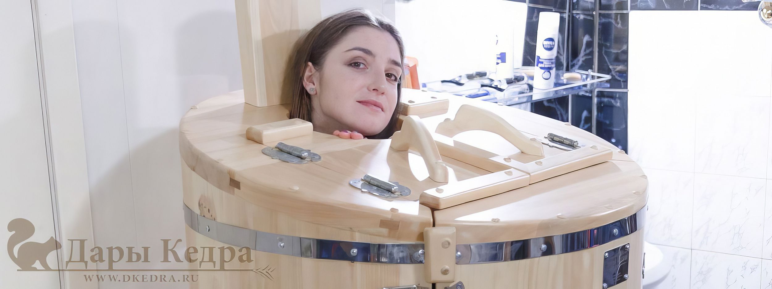 Принцип работы кедровой бочки очень схож с парением в русской бане: влажный пар, насыщенный травами и фитонцидами кедра, при температуре воздуха 45-60С глубоко воздействует на тело человека. При этом влажность воздуха внутри фитобочки по аналогии с русской баней составляет 60-75%. Такой диапазон считается наиболее комфортным для русского человека, окружающая среда которого в зимнее время года отличается низкой влажностью. Сухой морозный воздух провоцирует организм на потребность в согреве с высоким процентом влажности. Поэтому с древних времен на Руси всегда строили бани с целью субботнего омовения, оздоровления и закаливания в парной.