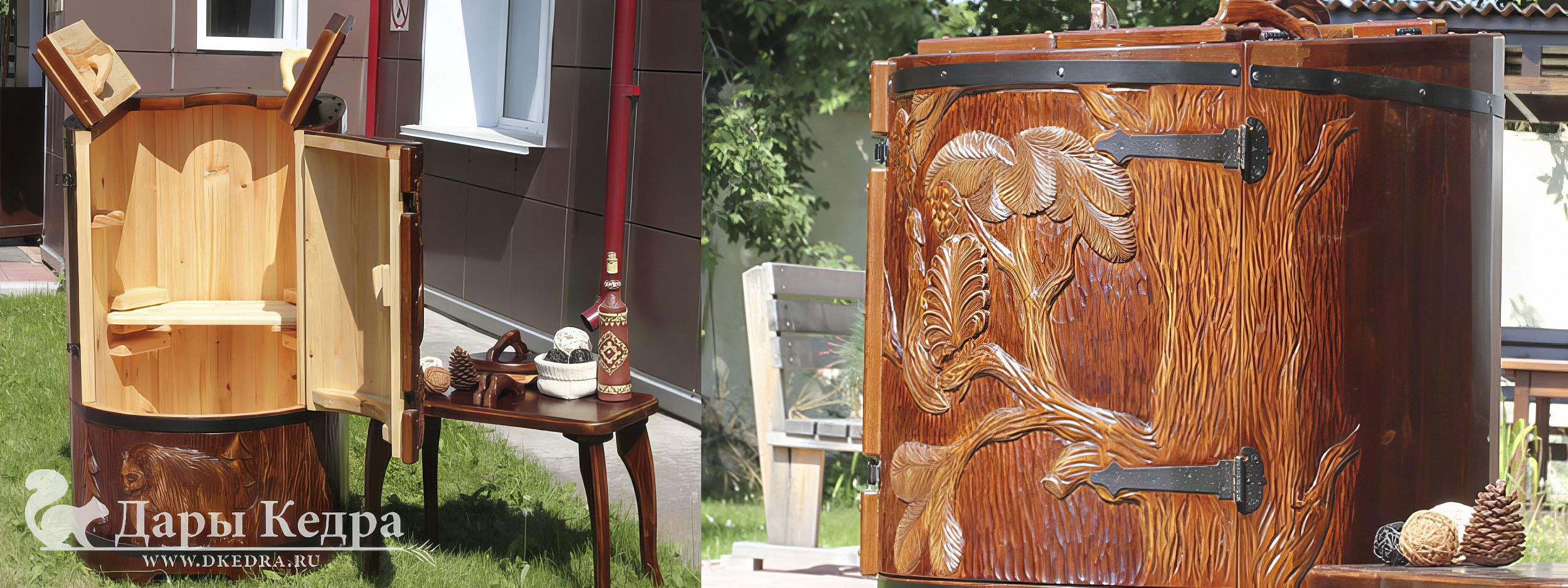 В этом случае фитопарную можно изготовить с резьбой, покрытием в подходящий цвет от светлых до темных оттенков, а также дополнить аксессуаром. Это может быть рама для зеркала, столик, консоль или сундук для удобного размещения фитосборов или парогенератора, а также другие дизайнерские решения, которые вы выберете. Наша компания отличается от многих другим своим лояльным подходом, гибкостью и доступной ценой производимых изделий.